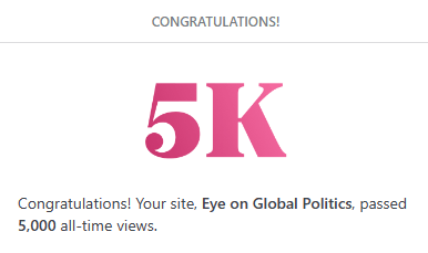 On August 24th, EyeOnGlobalPolitics.com received its 5,000th site view. Thanks for your support!